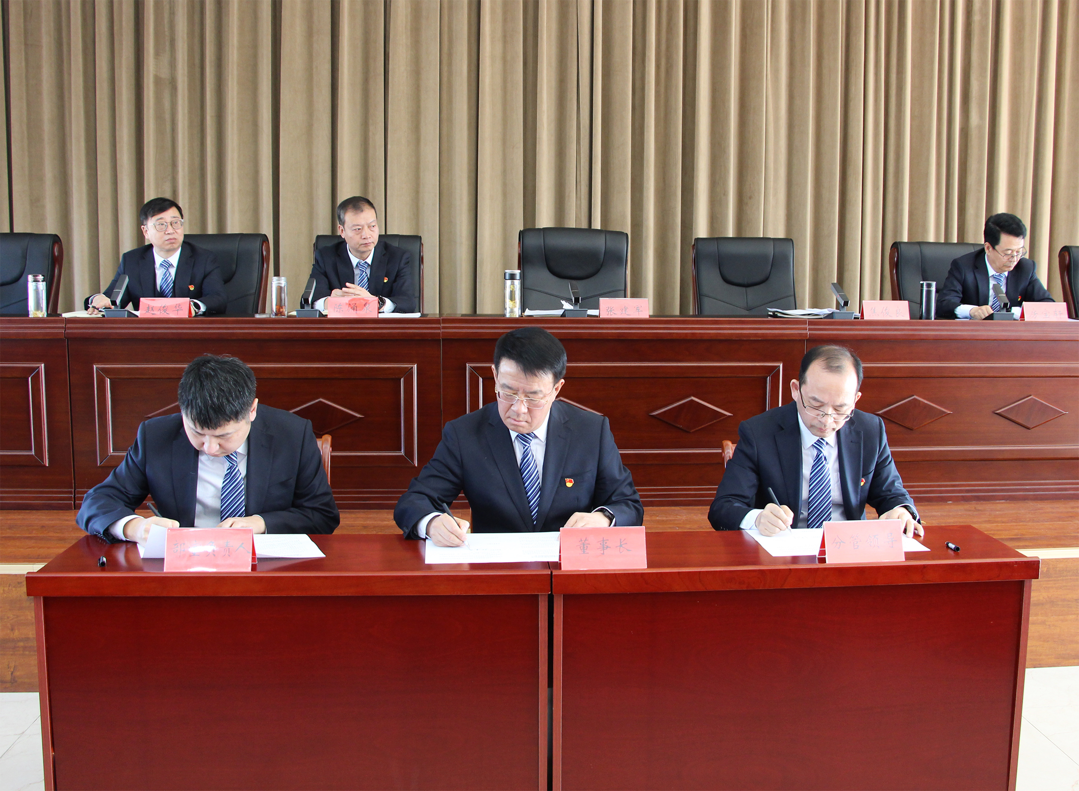 会议宣读了集团公司2022年度受表彰情况,通报了获得年度优秀的部室、子公司、中层管理人员及员工,与会领导向获奖集体和个人颁发了锦旗、荣誉证书。按照2023年度工作部署要求,党委书记、董事长张建军代表集团公司逐一与集团公司各部室及实际控制子公司签订了《2023年度绩效考核目标责任书》,坚持目标导向,强化责任,传导压力。