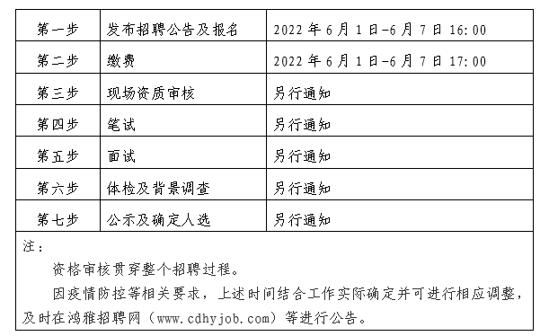 2022年6月1日至2022年6月7日16:00 在鸿雅招聘网(http://www.cdhyjob.com/)、鸿雅微信公众号、米兰买球·(中国)官方网站官方网站(/)及上级部门要求的相关网站等发布招聘公告。