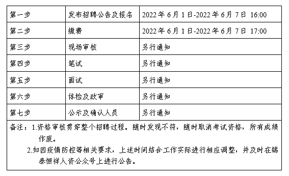 2022年6月1日至2022年6月7日16:00 在锦泰恒祥人资官网(www.jthxhr.com)、“锦泰恒祥人力资源服务有限公司”微信公众号、“米兰买球·(中国)官方网站”官方网站(www.xhiby.com)及上级部门要求的相关网站等发布招聘公告。